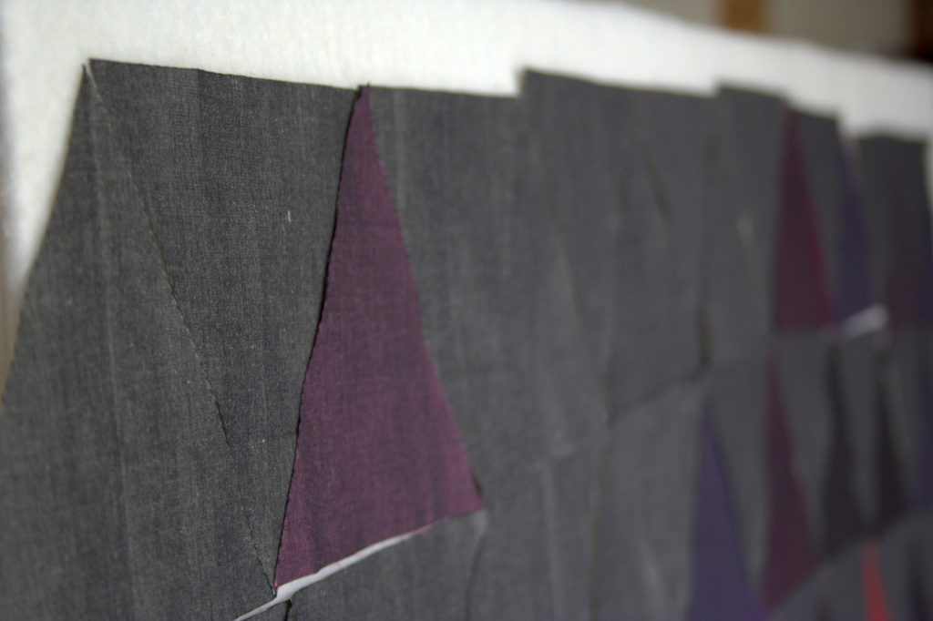Once your pieces are cut, lay them out as shown. A piece of batting wrapped around a large wall board works well, but I have been often known to use my design floor to help with layout, too! (SizingNote: if you want a larger quilt, you could add a row of grey (Lipari Pollara) triangles to the right and left sides before sewing the rows together to maintain the outer triangle points when adding borders. Then, trim square and add rectangular borders to the desired size.)