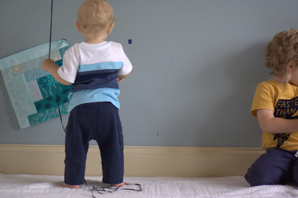 Within the past week, Finn has fully mastered walking and now prefers it over crawling. He joyfully walks circles around the house, his wobbly steps getting stronger and smoother by the day. This joy of walking certainly made this photo shoot the most difficult yet! I got one, only one, photograph of Finn relatively near his final quilt block, and while it’s not as clear as I’d like, it’s staying.