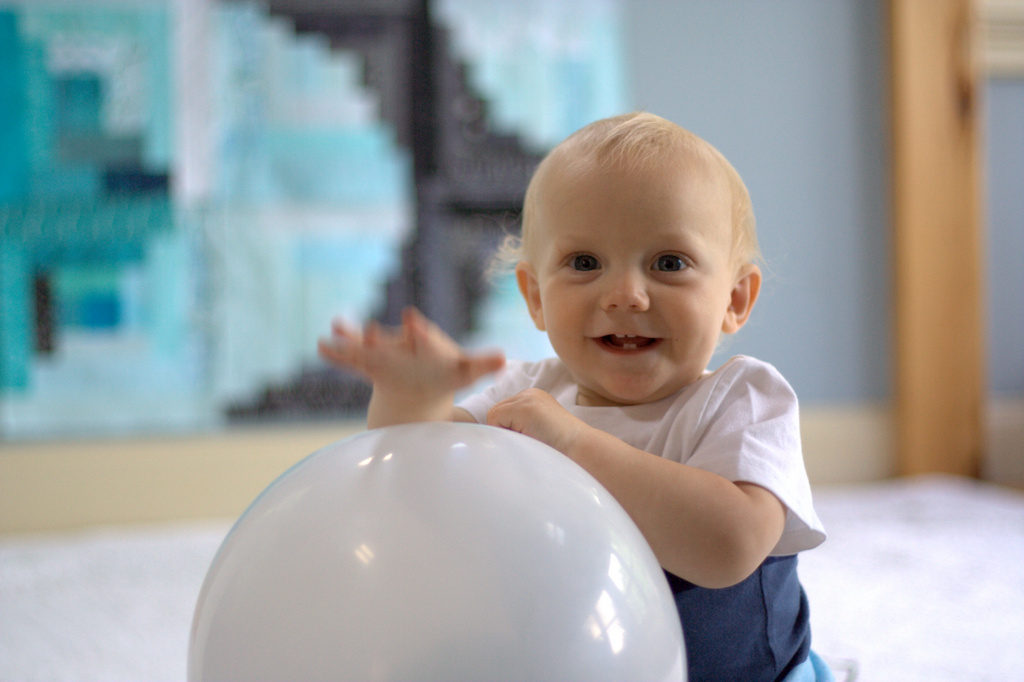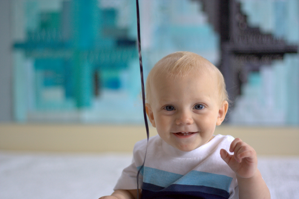 My big kids brought home a couple of balloons from their cousin’s first birthday this weekend (we had a full family birthday weekend with both Finn and cousin Reagan born 26 hours apart), and they have become the favorite toy for all three kids. (Safety note: Yes, I know that balloons are not technically safe for babies, so I will reassure you here that I only allow Finn to play with the balloon when I am directly supervising him!) I figured giving Finn something fun to hold was my best bet at having him stand still for even a moment.