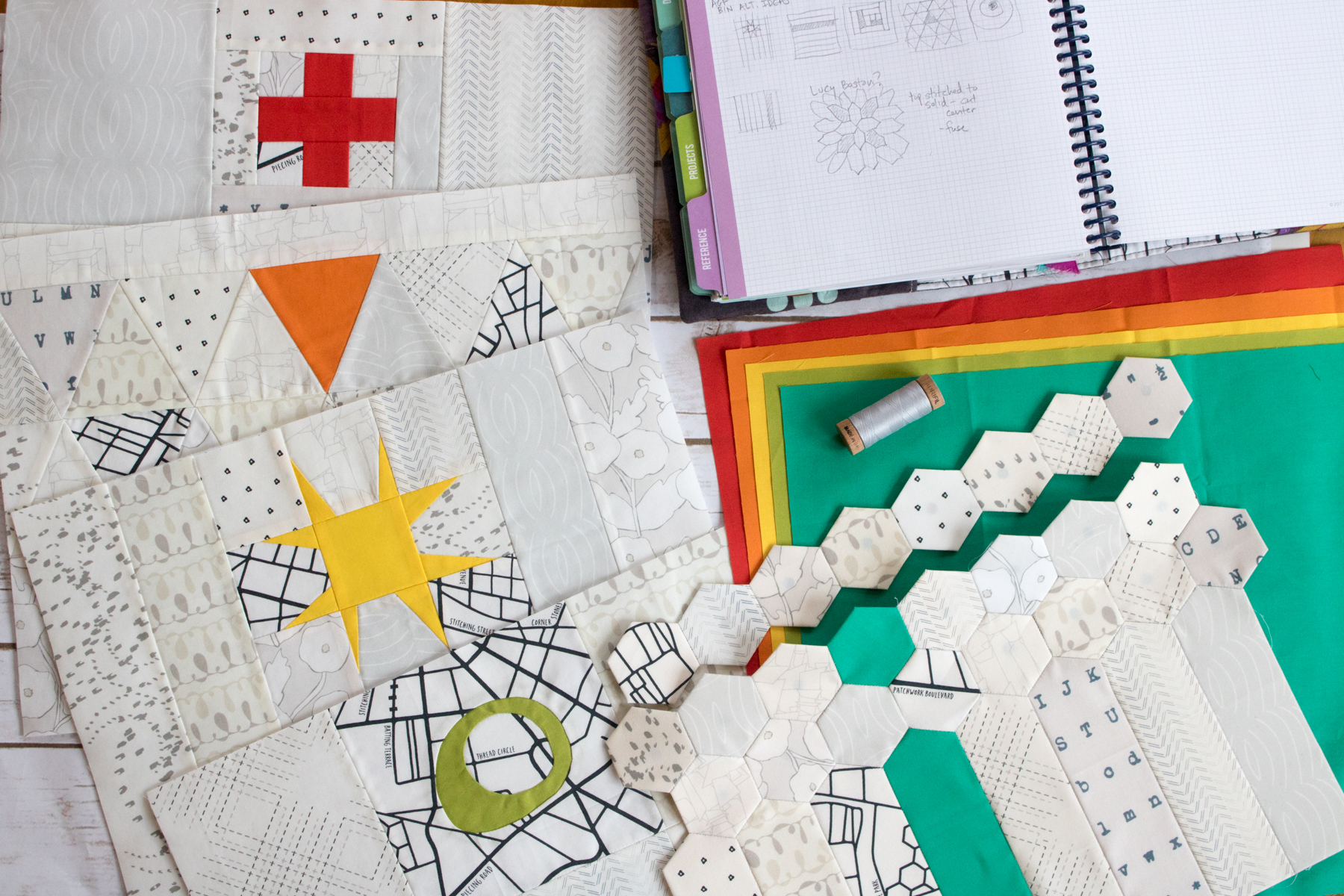 To get started, I sketched out a bunch of Skinny Bin design options in my Quilter’s Planner over the course of a week or so. I absolutely love the handy graph paper section of the planner! The first design that came to mind was the hexagon English Paper Pieced (EPP) Skinny Bin. I jokingly call it iBin because of the design that appears when using the extra-long hexagons I used for the bottom of the bin. Even with the time-saving elongated hexagons, I decided that rather than EPP ALL of the bins, why not mix it up and try a whole selection of block designs?!