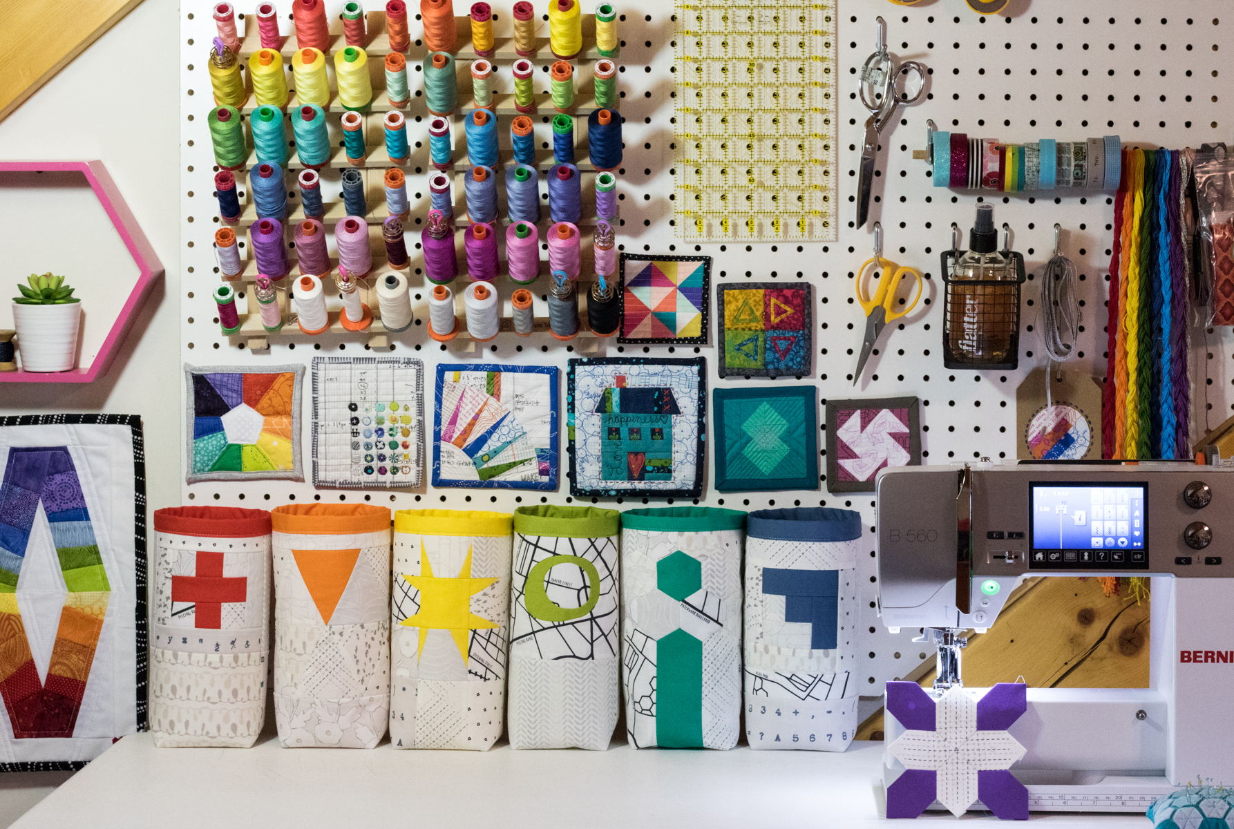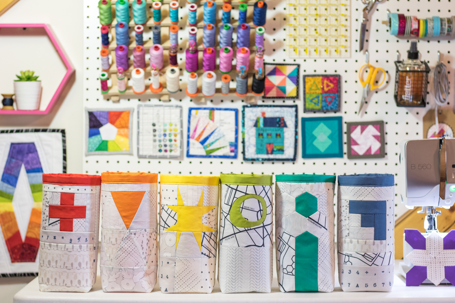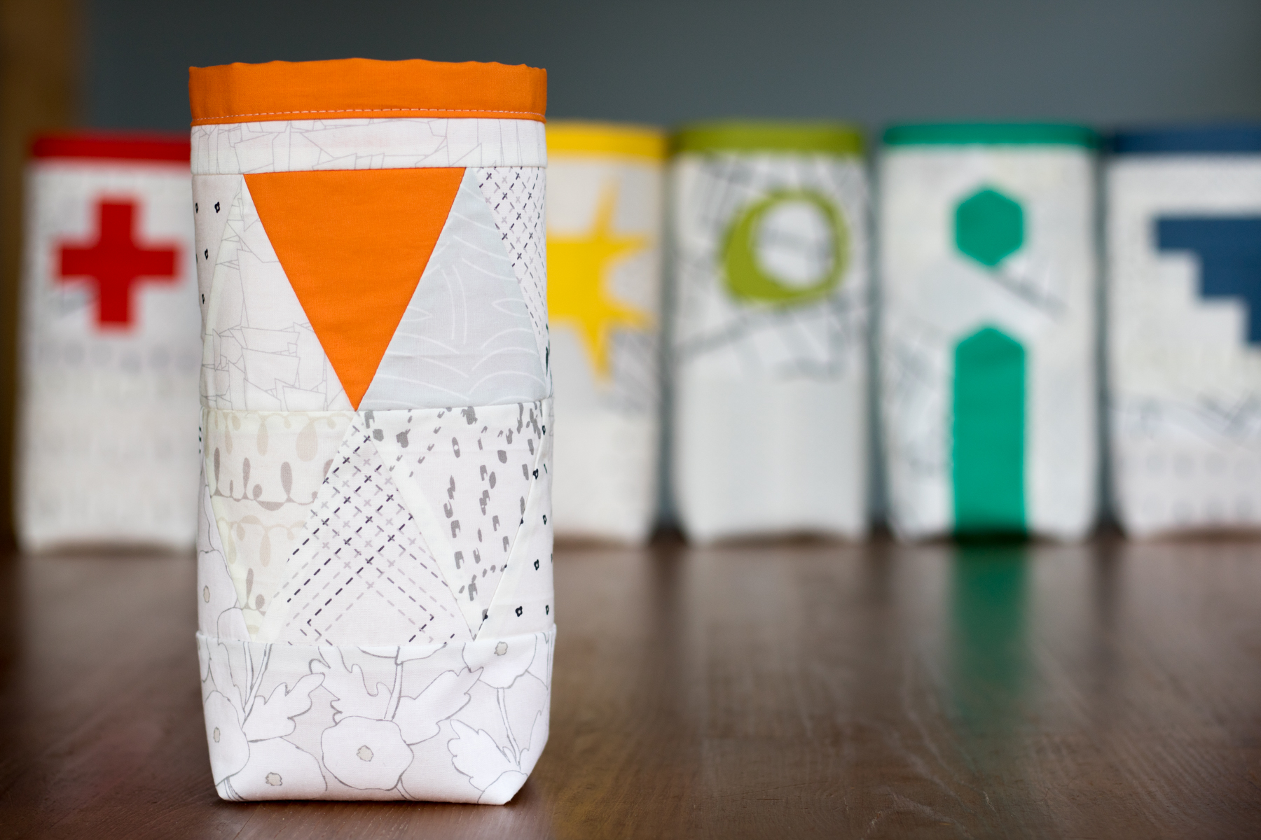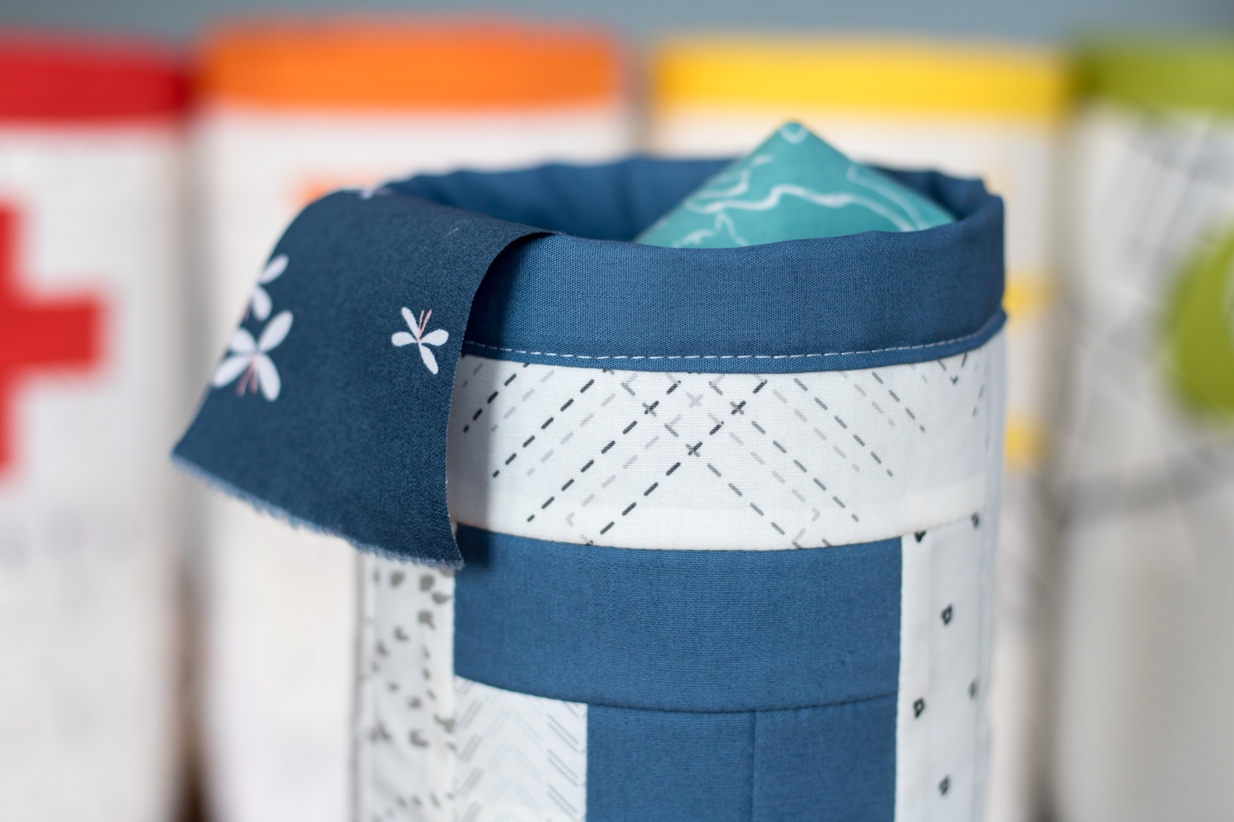 I love the variety of shapes, color, and design in these bins, and plan to add to them until I have a full primary, secondary, and tertiary rainbow! I sewed all of the bins with my go-to Aurifil 50wt 2600-Dove thread, but used 80wt to piece the EPP iBin. I absolutely understand the excitement about 80wt for EPP–the stitches melt right in!