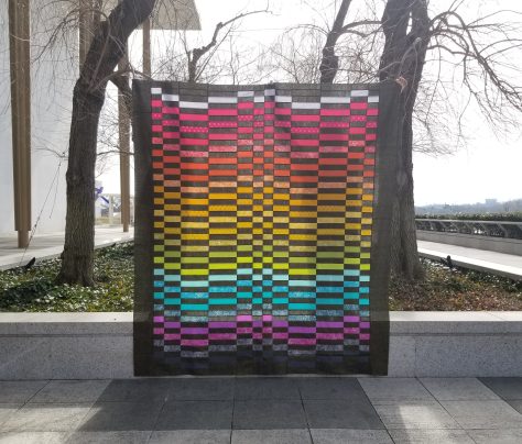 For this quilt, she used Giucy Giuce’s Spectrastic fabrics paired with Libs Eliott’s Venom fabric for the background, both by Andover fabrics, and it’s so much fun. I love how adding a non-solid background fabric changes the aesthetic of Staggered. You can find Darlene on Instagram @dcapulus, and I highly recommend following her, since she’s always making something gorgeous. This quilt is currently finished and living at my house, since Darlene sent it to me so that I could take fun photos with it… stay tuned for that!