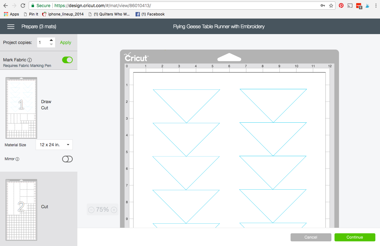 Log into Cricut Design Space and get my Flying Geese Table Runner with Embroidery project here, and click “Make it!”