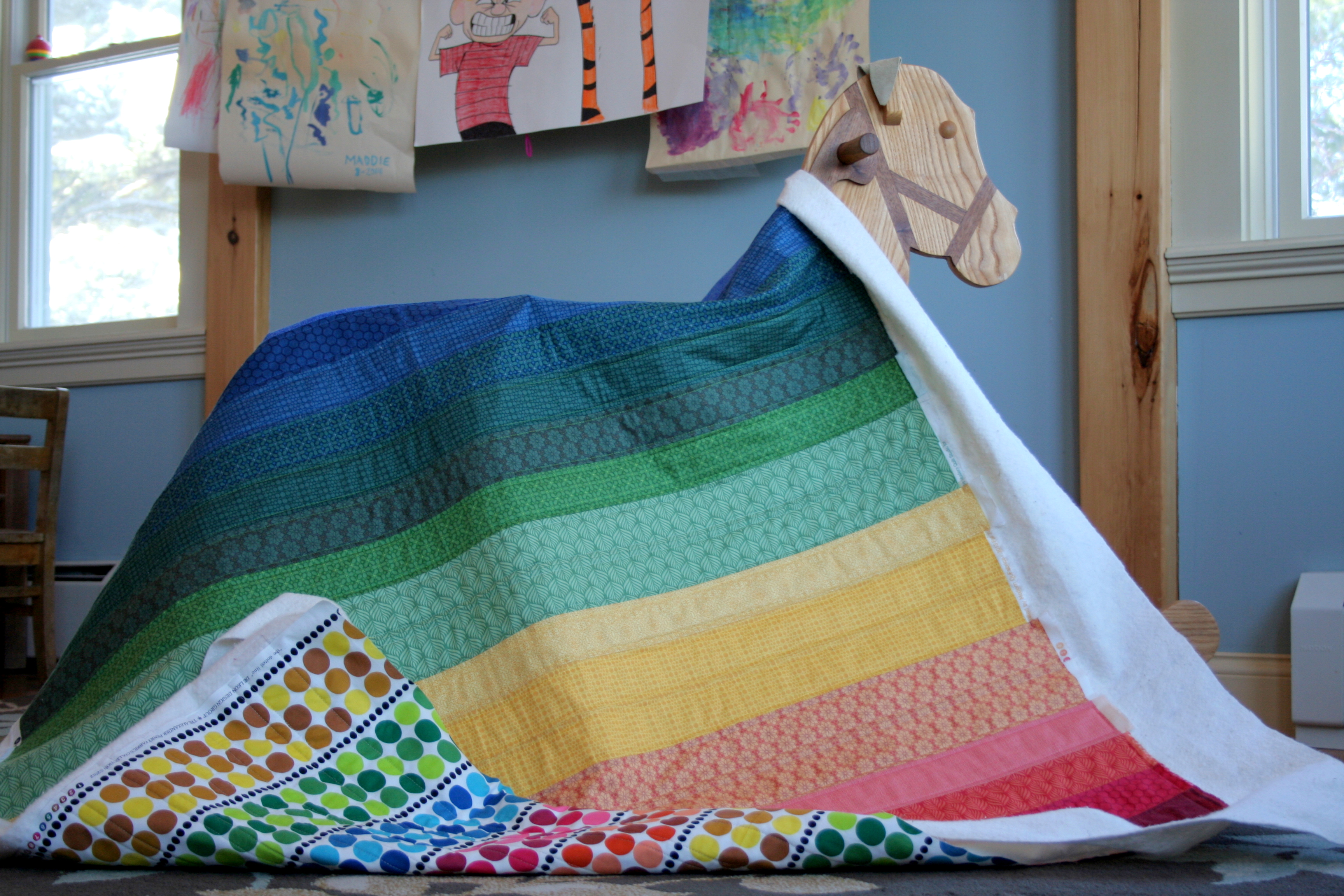 I love the look of the back of a freshly pieced quilt, even with kids flopped on it.Rainbow jellyroll quilt top front.Rainbow jellyroll quilt top back.