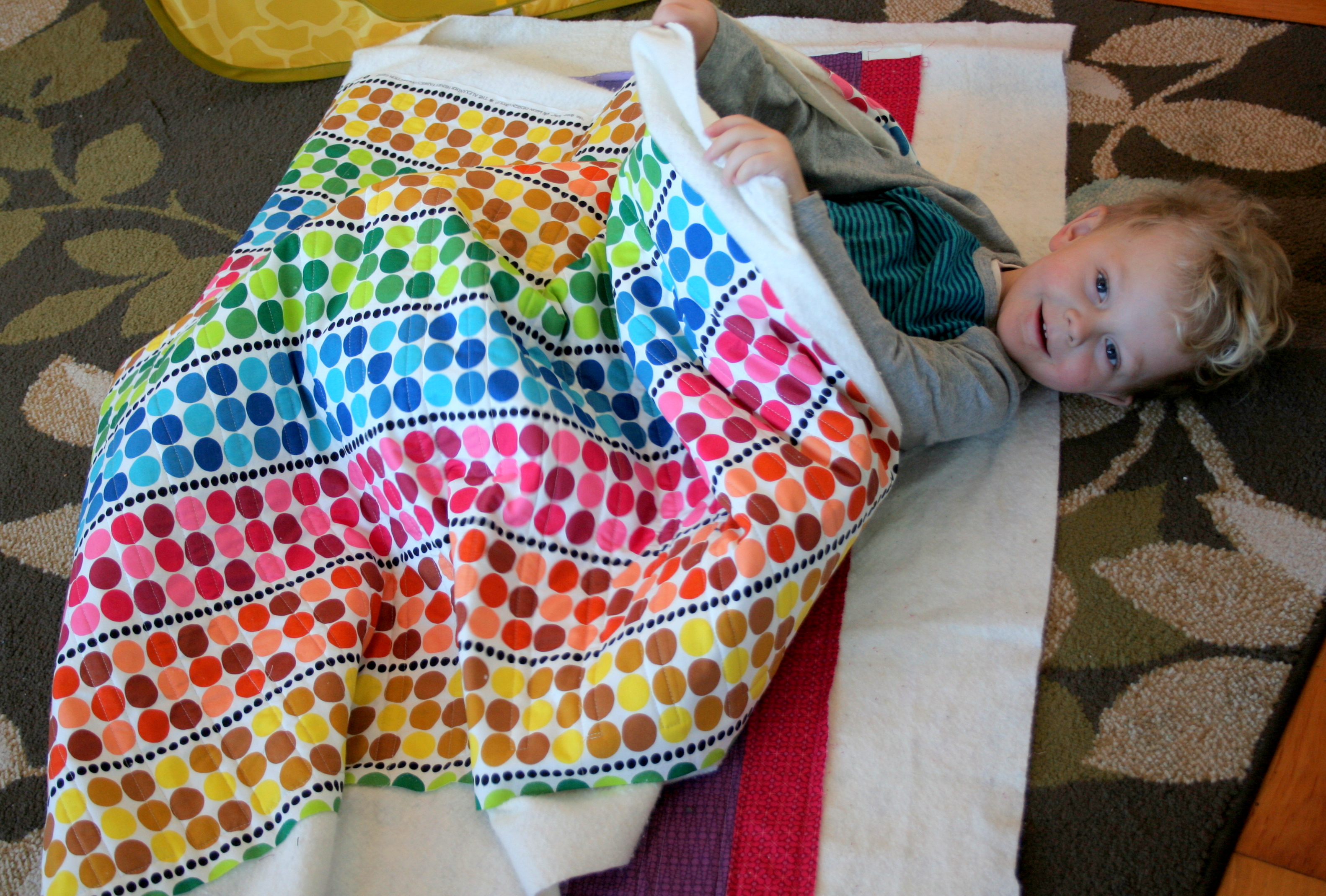 I quilted it with straight lines 1/4″ from each seam, in coordinating colors of Aurifil 40wt thread. I am LOVING it and clearly, so is my little helper. This quilt is for Maddie, but Max certainly had a grand old time rolling around with it during the photo shoot while Maddie was in preschool.