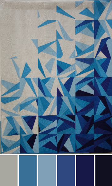 This palette features Krista in front of her gorgeous quilt Chess on the Steps, which hung at QuiltCon. I’m intrigued by this quilt, which she calls “improv under the influence”, since it’s a quilt with a very improv feel, but created using traditional chain piecing methods. Those who know me know that I struggle with improv, but I feel like this quilt may be the place to begin! Fortunately, it was the pattern of the month in September 2014 and is available for free for members of the Modern Quilt Guild.